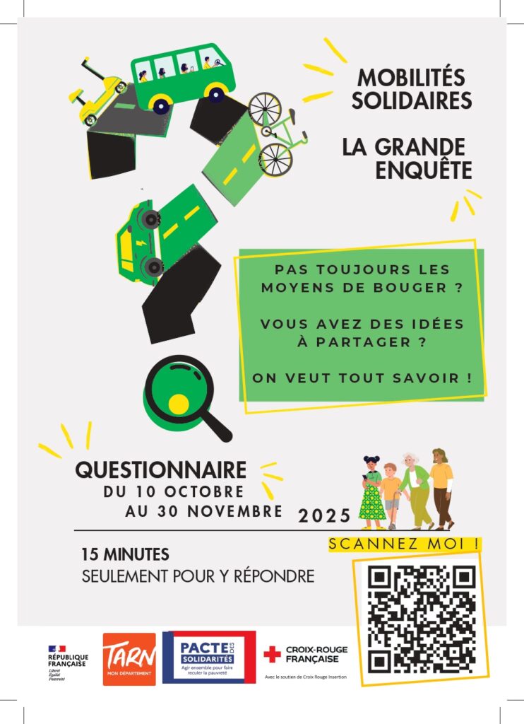 La Croix-Rouge, financée par le Conseil départemental et l’Etat, travaille à la création d’une Plateforme des mobilités solidaires dans le Tarn. Merci de prendre quelques minutes pour répondre à ce questionnaire qui nous permettra de mieux comprendre vos pratiques, besoins et difficultés de déplacement.